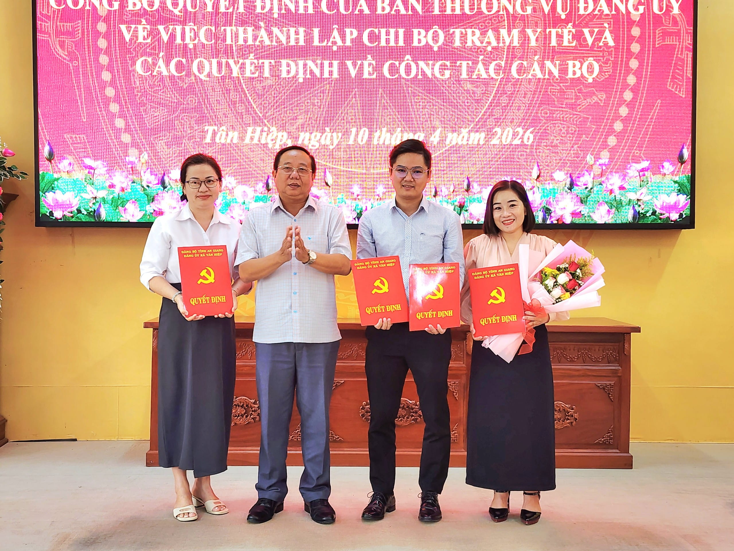 Ngày 10/4, Đảng ủy xã Tân Hiệp tổ chức hội nghị công bố Quyết định của Ban Thường vụ Đảng ủy về việc thành lập Chi bộ Trạm y tế xã Tân Hiệp và các Quyết định về công tác cán bộ. Đến dự hội nghị có đồng chí Lương Hoàng Anh - Phó Bí thư Thường trực Đảng ủy xã; đồng chí Trần Hoàng Thanh-UVBTV, Trưởng Ban Xây dựng đảng Đảng ủy xã; đồng chí Trần Thị Xuân Uyên-UVBTV, Phó Chủ tịch UBND xã.