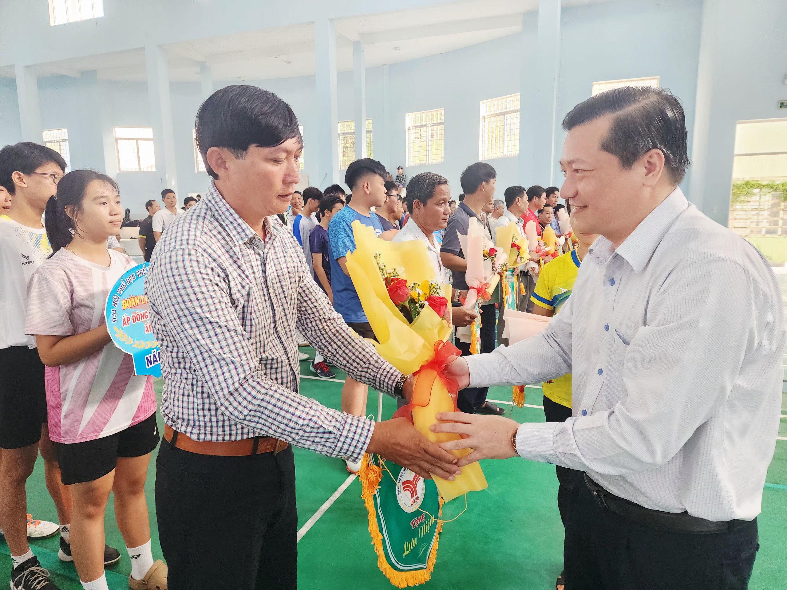 Đồng chí Đinh Xuân Phương - Bí thư Đảng ủy, Chủ tịch HĐND xã trao cờ và hoa cho các đội tham gia giải