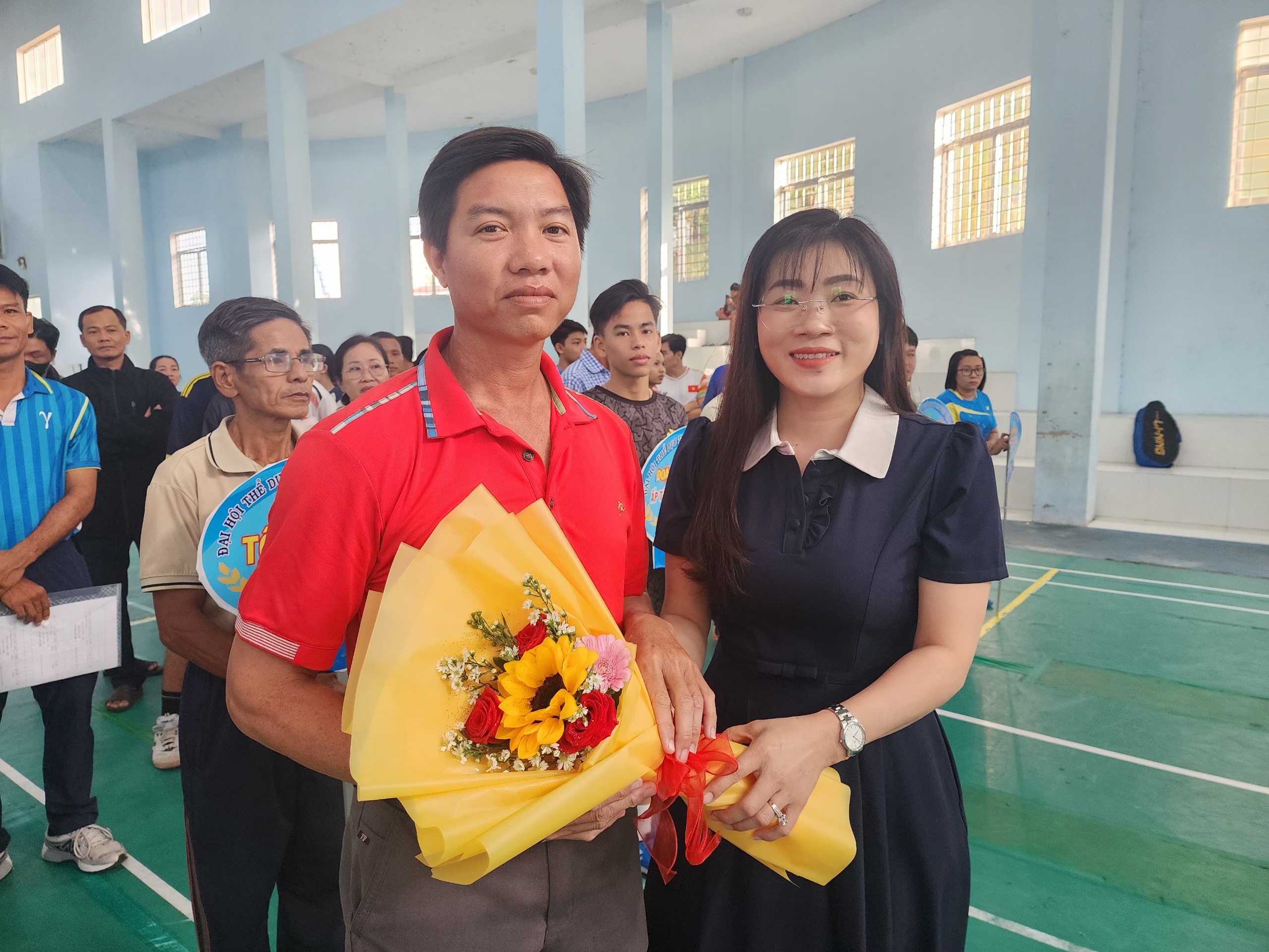 Đồng chí Trần Thị Xuân Uyên - Phó Chủ tịch UBND xã, kiêm Giám đốc trung tâm phục vụ hành chính công xã Tân Hiệp, Trưởng Ban tổ chức Đại hội TDTT xã Tân Hiệp trao cờ và hoa cho tổ trọng tài