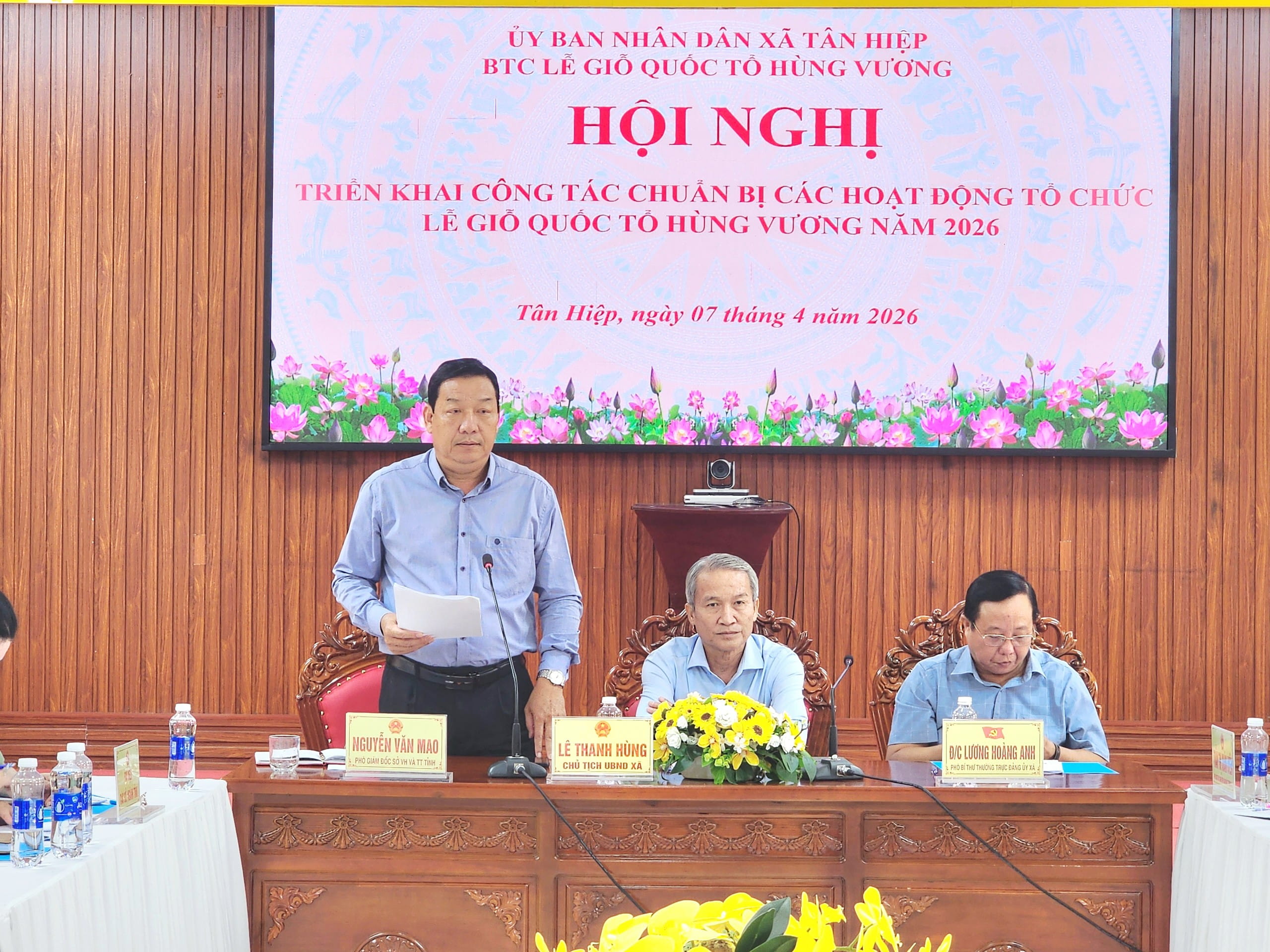 Ngày 07/4, Ủy ban nhân dân xã Tân Hiệp (tỉnh An Giang) tổ chức Hội nghị triển khai công tác chuẩn bị các hoạt động Lễ Giỗ Quốc Tổ Hùng Vương năm 2026. Đến dự hội nghị có ông Nguyễn Văn Mao - Phó Giám đốc Sở Văn hóa và Thể thao tỉnh, cùng đại diện lãnh đạo các sở, ban, ngành cấp tỉnh.