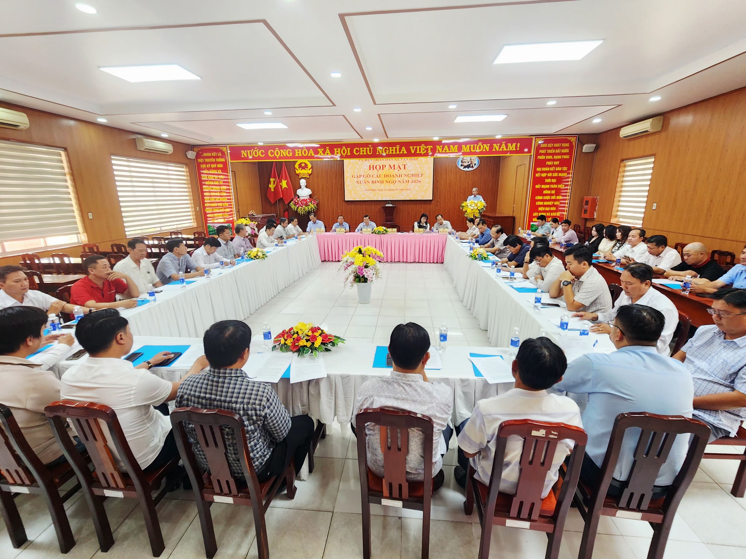 Chiều ngày 22/01, UBND xã Tân Hiệp tổ chức buổi Họp mặt các doanh nghiệp, cơ sở sản xuất kinh doanh tiêu biểu nhân dịp Xuân Bính Ngọ 2026. Đây là hoạt động thường niên nhằm tôn vinh những đóng góp quan trọng của đội ngũ doanh nghiệp đối với sự nghiệp phát triển kinh tế - xã hội tại địa phương. Tham dự buổi họp mặt có đồng chí Đinh Xuân Phương - Bí thư Đảng ủy xã, Chủ tịch HĐND xã; lãnh đạo HĐND, UBND, Ủy ban MTTQ xã cùng hơn 40 đại diện các doanh nghiệp và hộ kinh doanh trên địa bàn.