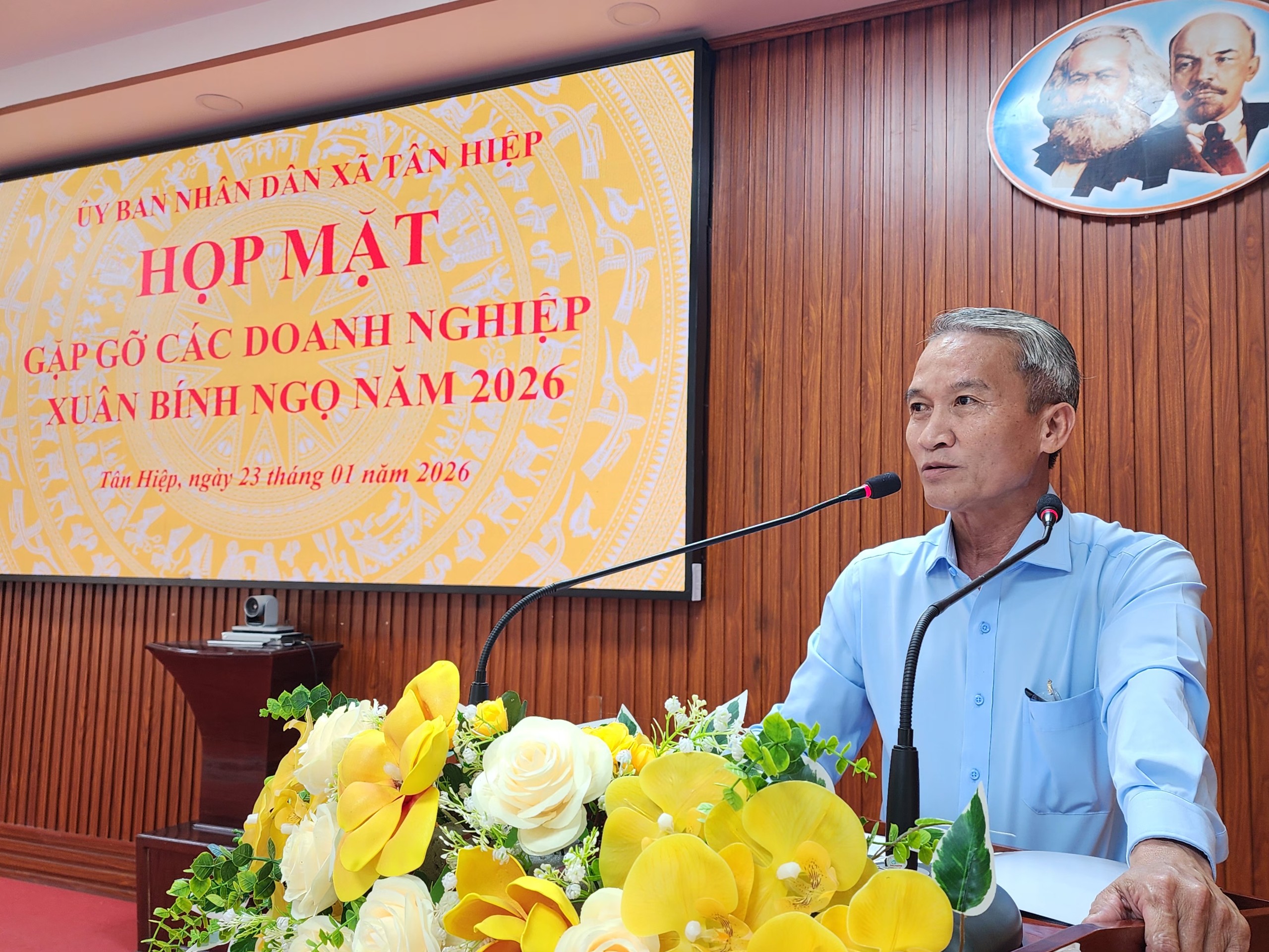 Thay mặt lãnh đạo địa phương, đồng chí Đinh Xuân Phương - Bí thư Đảng ủy, Chủ tịch HĐND xã gửi lời chào trân trọng, lời chúc mạnh khỏe, thành công, bước sang năm mới 2026 có nhiều khởi sắc mới, thắng lợi mới đến toàn thể các doanh nghiệp, cơ sở sản xuất tiêu biểu. Đồng chí nhấn mạnh: Chính quyền xã Tân Hiệp luôn xác định sự thành công của doanh nghiệp cũng chính là sự phát triển của địa phương. Trong năm mới Bính Ngọ 2026, chúng tôi cam kết tiếp tục tạo mọi điều kiện thuận lợi nhất về cơ chế, chính sách và môi trường đầu tư để các doanh nghiệp yên tâm sản xuất, mở rộng quy mô. Theo đó, Đảng bộ xã Tân Hiệp tiếp tục tập trung hoàn thành xây dựng quy hoạch chung của xã đến năm 2030, tầm nhìn đến năm 2050; đề ra các giải pháp để giữ vững ổn định chính trị, trật tự an toàn xã hội, qua đó tạo môi trường thuận lợi, an tâm cho hoạt động sản xuất, kinh doanh của các doanh nghiệp; đẩy mạnh phát triển kinh tế theo hướng bền vững, cải thiện môi trường đầu tư kinh doanh, khuyến khích phát triển doanh nghiệp; phát huy vai trò nền tảng của nông nghiệp gắn với ứng dụng khoa học công nghệ, từng bước nâng cao tỷ trọng thương mại dịch vụ. Tiếp tục chăm lo tốt hơn công tác an sinh xã hội, giải quyết việc làm, giảm nghèo bền vững, nâng cao đời sống nhân dân… Đảng bộ, chính quyền xã Tân Hiệp mong rằng các doanh nghiệp tiếp tục quan tâm, hỗ trợ và đồng hành của cộng đồng doanh nghiệp. Trong đó, đồng hành trong đầu tư, mở rộng trong sản xuất kinh doanh gắn với phát triển của doanh nghiệp, trách nhiệm của xã hội chung tay cùng địa phương chăm lo an sinh xã hội, xây dựng quê hương Tân Hiệp ngày càng phát triển, văn minh, nghĩa tình. Đảng bộ xã Tân Hiệp cam kết luôn lắng nghe, đồng hành và hỗ trợ doanh nghiệp, kịp thời tháo gỡ khó khăn, vướng mắc trong công việc; xây dựng mối quan hệ “Chính quyền kiến tạo, doanh nghiệp phát triển, Nhân dân thụ hưởng” trên tinh thần hợp tác tin cậy và cùng phát triển.
